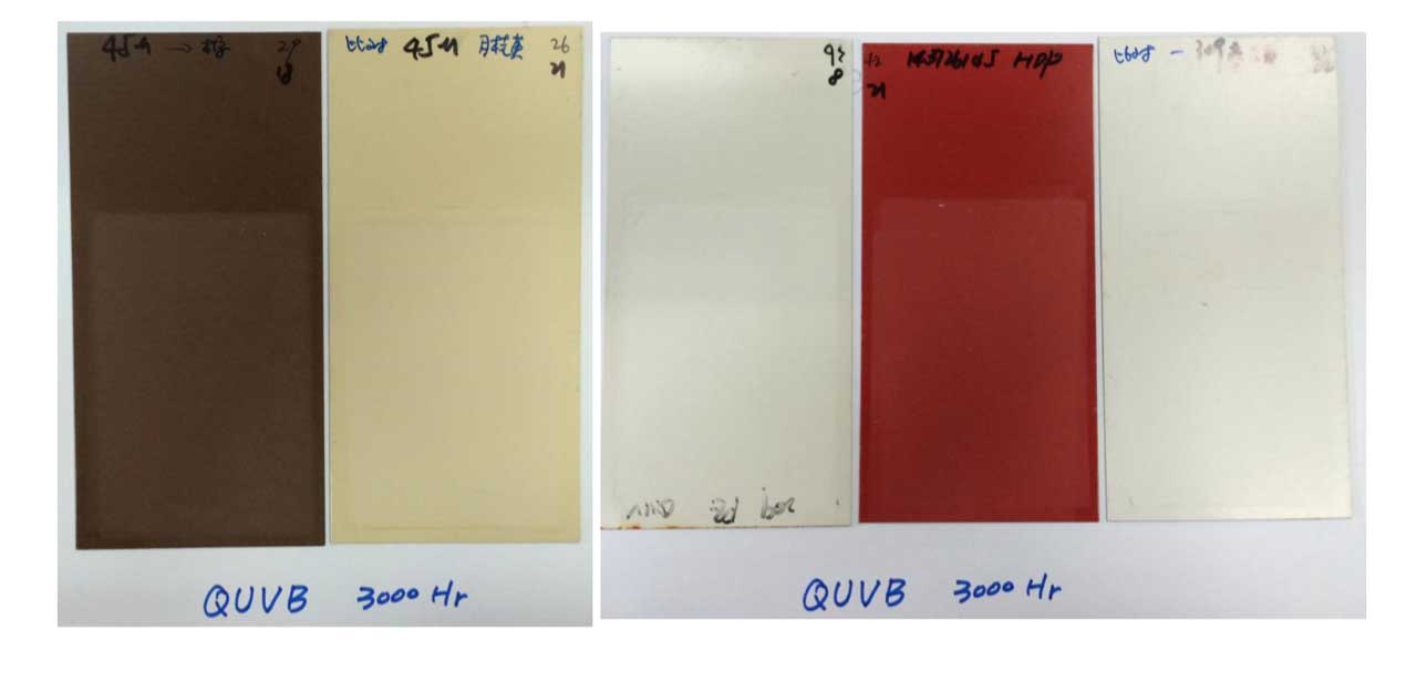 • 經過3000小時QUVB試驗后,45微米氟碳產品涂層粉化仍保 持0級。