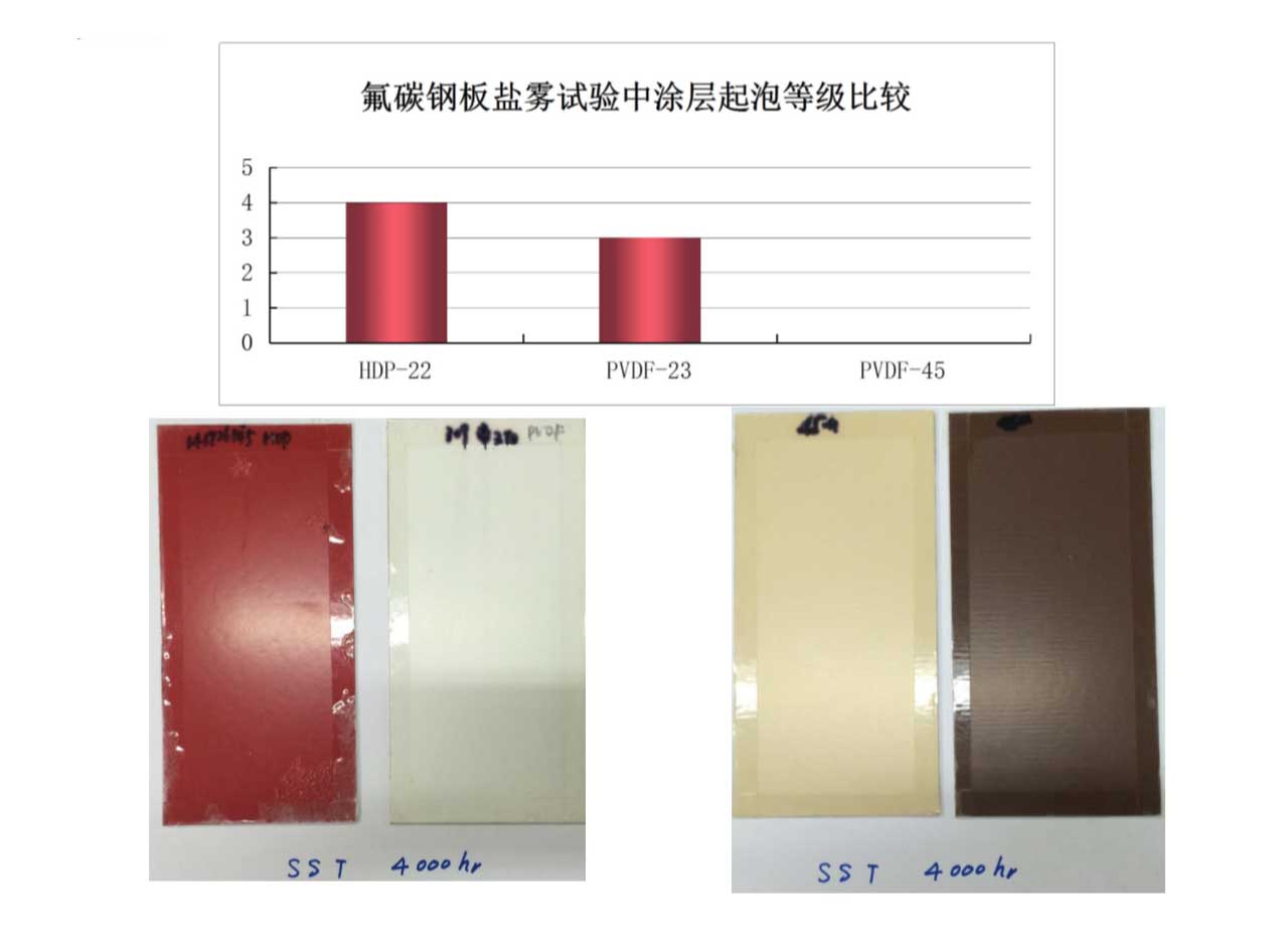 • 經過4000小時鹽霧試驗后,45微米氟碳產品涂層仍保持0級。