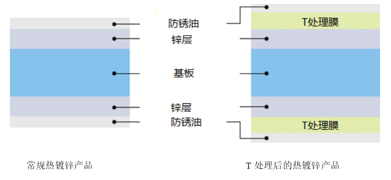 自潤(rùn)滑T處理,根據(jù)熱鍍鋅基板的不同可分為GA-T和GI-T產(chǎn)品,但膜層基本相同。該自潤(rùn)滑膜非常薄,約為10~20nm,其微觀形貌仍然為原熱鍍鋅鍍層的微觀形貌。其截面示意圖如下:
